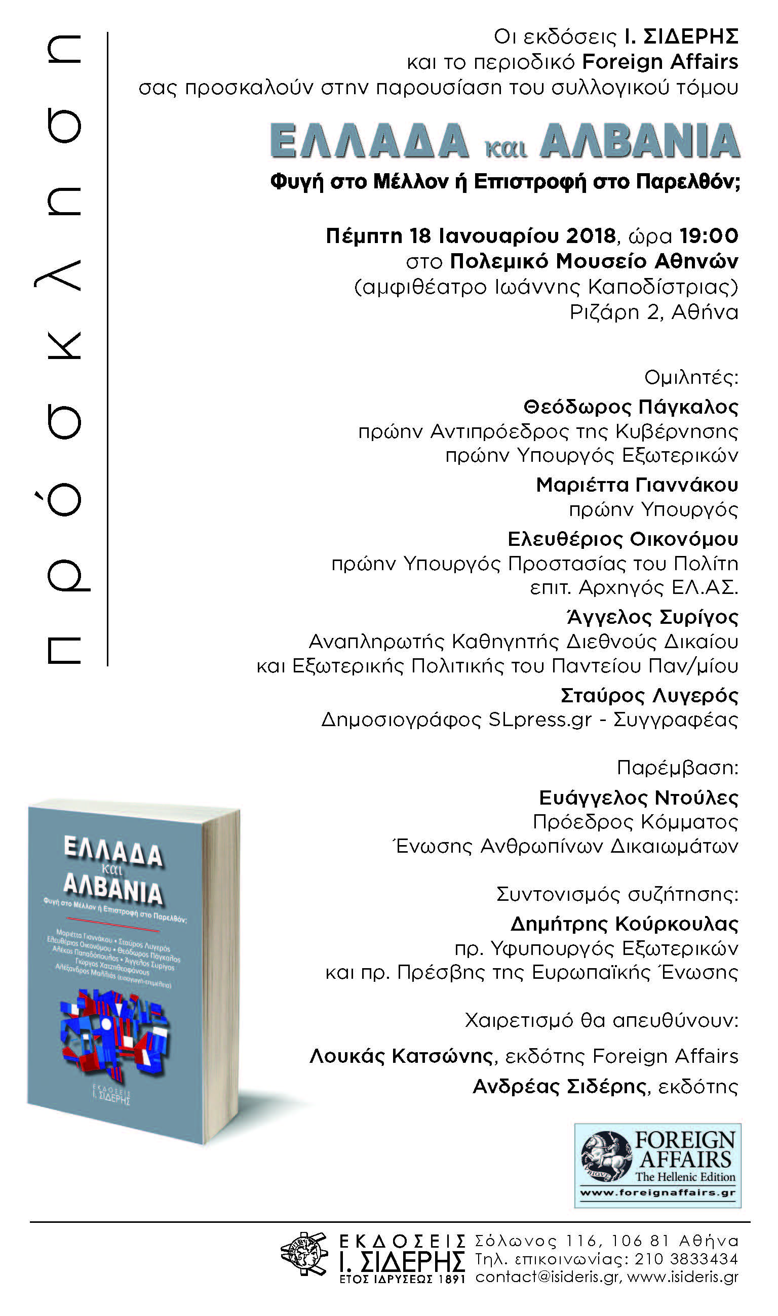 Πρόσκληση | ΕΛΛΑΔΑ και ΑΛΒΑΝΙΑ | Πολεμικό Μουσείο Αθηνών 03/01/2018 – Posted in: Τα νέα μας – Tags: Ελλάδα και Αλβανία, Πολεμικό Μουσείο