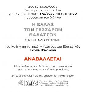 Αναβολή Παρουσίασης του βιβλίου του Γιάννη Βαληνάκη | Η Ελλάς των Τεσσάρων Θαλασσών 09/03/2020 – Posted in: Τα νέα μας