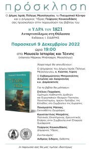 Βιβλιοπαρουσίαση | Παρασκευή 9 Δεκεμβρίου 2022 ώρα 19:00 στο Μουσείο Ιστορίας και Τέχνης (πλατεία Μάρκου Μπότσαρη, Μεσολόγγι) 05/12/2022 – Posted in: Τα νέα μας